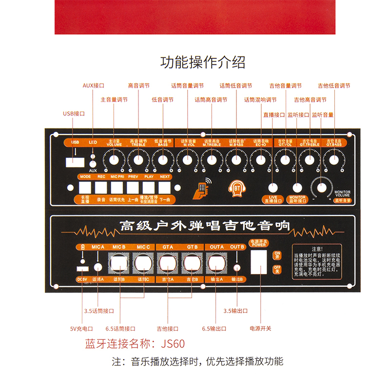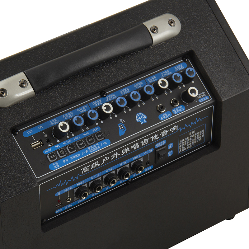 • 吉他输入孔两个:6.5MM插孔可调音量/高音/低音